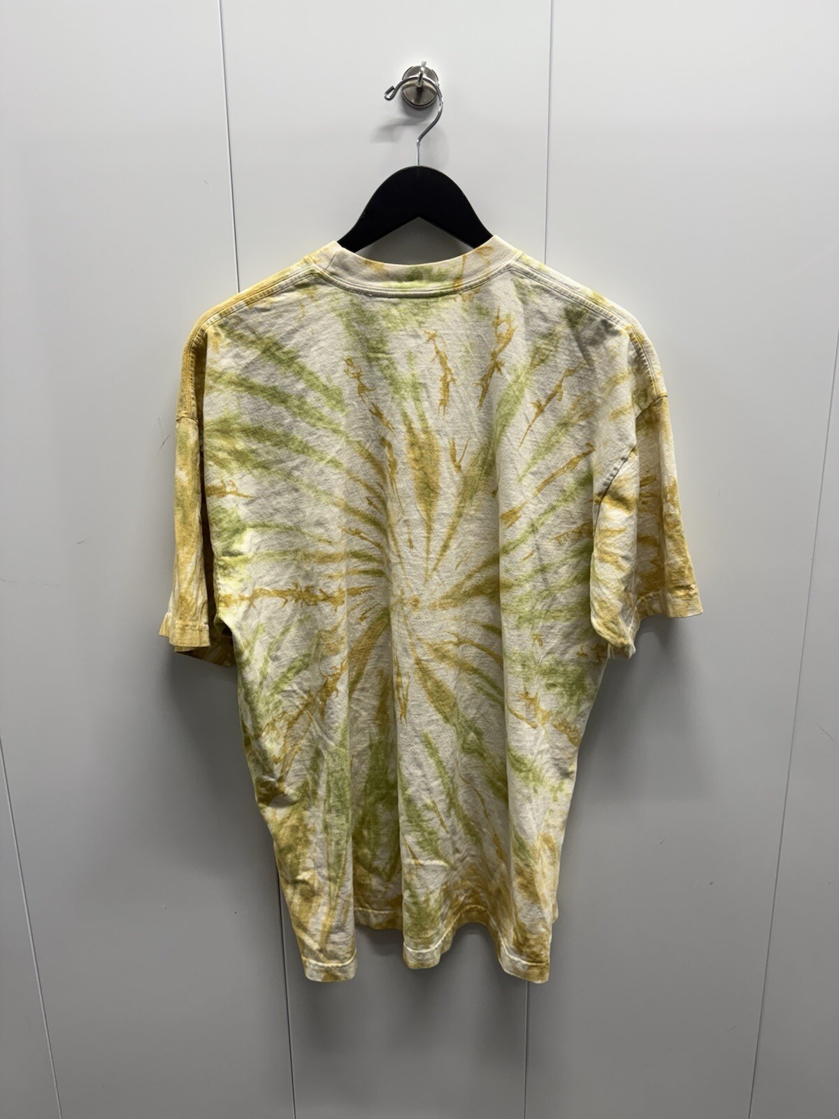 This XL T-shirt from Online Ceramics features a vibrant yellow tie-dye design with a unique graphic print of a bear, moon, and star. The shirt has a regular fit, short sleeves, and a classic crew neck neckline. It is designed for men and showcases an animal theme. This T-shirt is a stand-out piece that combines artistic elements with comfortable everyday wear.