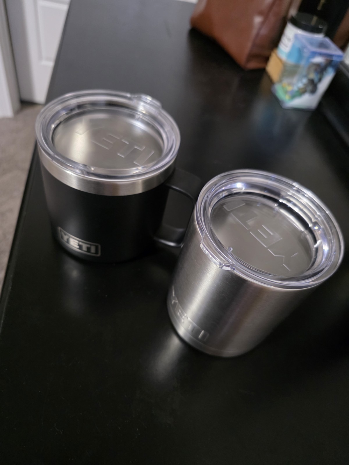 YETI Rambler (Black) 14 oz Stackable Mug with a MagSlider Lid/ 10 oz (Silver) Stackable Lowball with lid. Great condition. Price is for both together.
