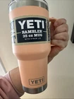 The YETI Rambler 35 oz Lowcountry Peach Color BPA-Free Straw Mug is a three-piece stainless steel straw mug designed to keep your hot or cold beverages at the desired temperature for a long time. The mug features a solid color pattern and a peach-colored lid with a straw access hole. It measures 8.3 inches in height and 5.1 inches in width. The mug is dishwasher safe and comes with a handle, making it easy to carry and clean. The YETI Rambler is a popular brand known for its high-quality insulated mugs and this model is no exception. It is perfect for outdoor adventures, road trips, or just everyday use. MUG HAS A LITTLE TINNY SCRATCH ON THE HANDLE. Please check picture. SOLD AS IS