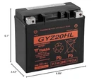 The highest CCA motorcycle battery, GYZ batteries feature taller plates for extra surface area creating more power: up to 500 CCA and 32 Ah to power more accessories. Made with an enhanced active and separator materials: compounded to withstand vibration, prolong battery life and dependability. Absorbed Glass Mat (AGM) separators absorb electrolyte making the battery nonspillable, the valve regulated design eliminates water loss and the need for refilling. Factory Activated (FA) – the battery is filled with electrolyte, sealed and charged at the factory. Size/Weight - Length: 6 7/8 in (175 mm), Width: 3 7/16 in (87 mm), Height: 6 1/8 in (155 mm), Weight with Acid (lbs.): 15.7; Specs - Capacity Ah: 20 @ 10HR, Regular Charge Current (Amp): 2, C.C.A. @ 0 °F (-18 °C): 320 The highest CCA motorcycle battery, GYZ batteries feature taller plates for extra surface area creating more power: up to 500 CCA and 32 Ah to power more accessories Made with an enhanced active and separator materials: compounded to withstand vibration, prolong battery life and dependability Absorbed Glass Mat (AGM) separators absorb electrolyte making the battery nonspillable, the valve regulated design eliminates water loss and the need for refilling Factory Activated (FA) – the battery is filled with electrolyte, sealed and charged at the factory