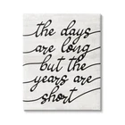 We create our stretched canvas to the highest standards. Using only the highest quality inks and canvas on Mimaki printers, we hand-cut and stretch each piece over a 1.5-inch thick wooden frame for hanging. As a result, the art comes ready to hang on the sturdy ledge with no installation required. Wall Art is made in the USA. Stretched Canvas Sizes Include Standard: 16 x 1.5 x 20 Large: 20 x 1.5 x 30 X-Large: 30 x 1.5 x 40 Oversized: 36 x 1.5 x 48 Wall Art is Ready to Hang with Hardware Free Hanging. No installation required. For Easy Set Up Lean or Layer Artwork on Shelf or Against Wall. Our stretched canvas is created with the highest standards. We use only the highest quality inks and canvas on our in house Mimaki printers, and then hand cut and stretch each piece over a 1.5 inch thick wooden frame for hanging. Made In USA. Artwork Relates To: Phrase, Rustic, The Days Are Long But The Years Are Short Design by Lil' Rue
