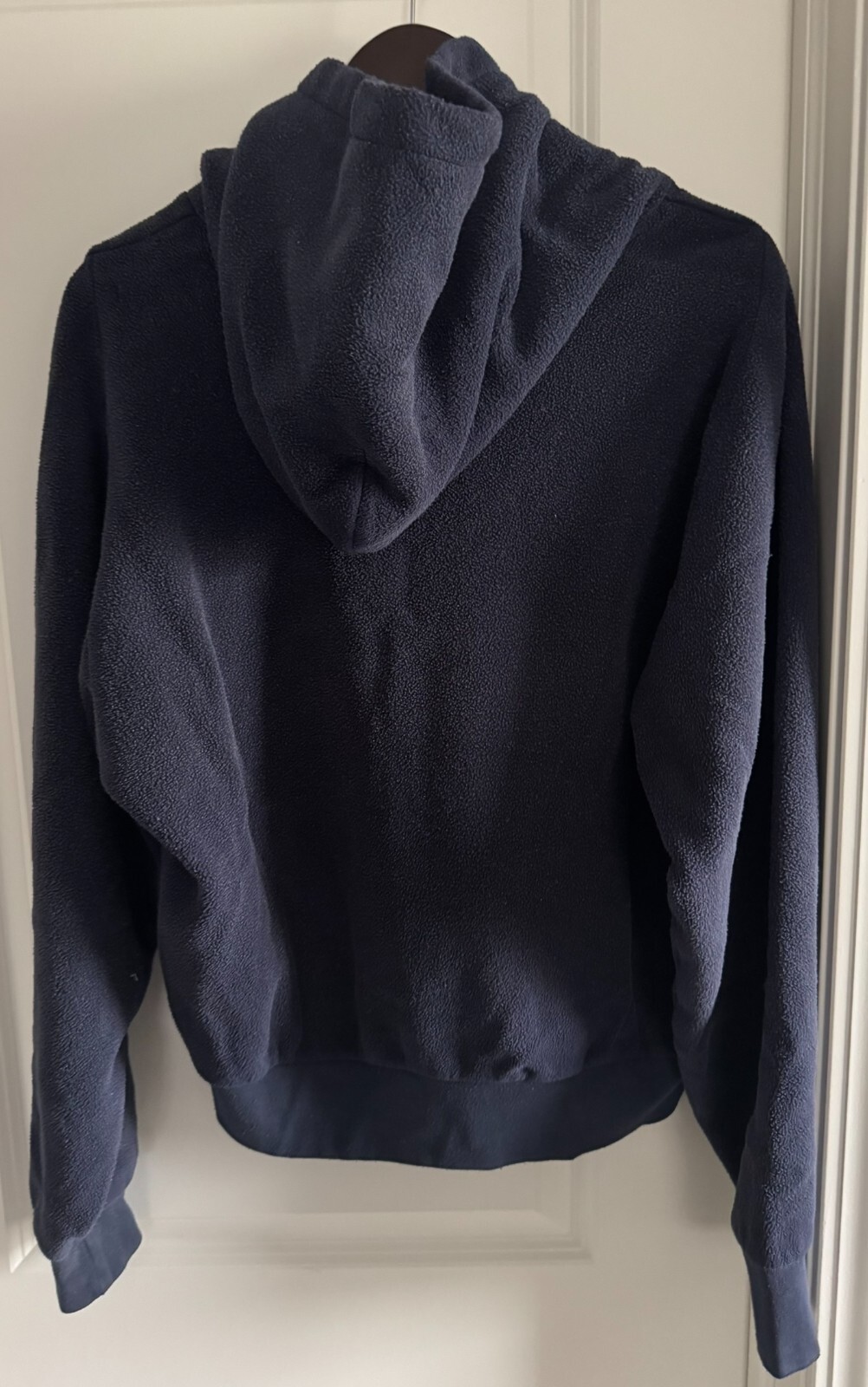 New in the bag. The Yeezy Gap H09 Polar Fleece Regular Fit Hoodie for Men in Navy, size M, features a pullover style with a round neck and long sleeves. Made from a cozy fleece fabric blend of polyester and cotton, this hoodie has a lined hood, front pocket, and tagless design for comfort. The design includes a solid pattern with accents of a YZY x GAP product line. It is suitable for winter, fall, and spring seasons, and can be machine washed for easy care. The hoodie showcases a blend of nature, art, and classic themes, making it a versatile and stylish addition to any wardrobe.