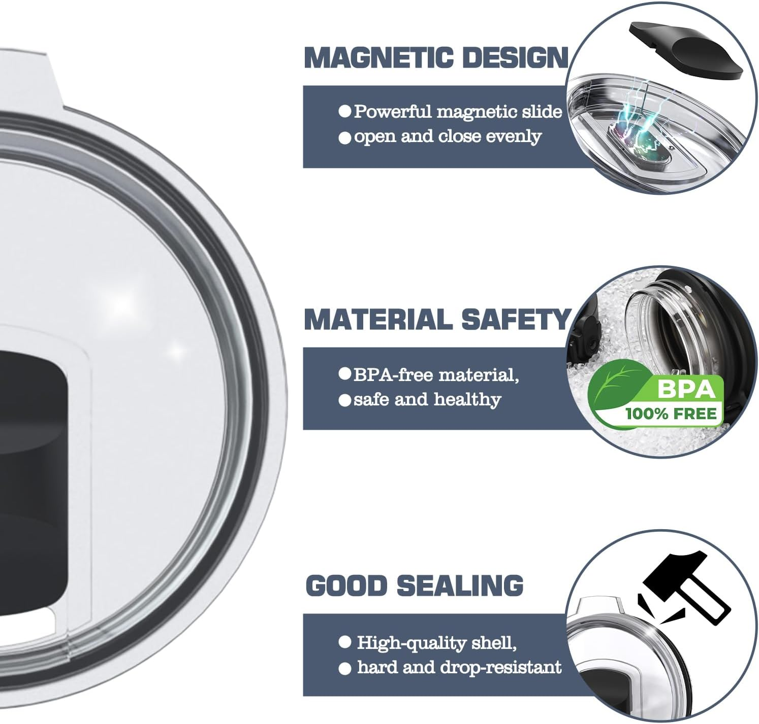 Store New Arrivals Add to Favorite View Feedback Contact 30 Oz Tumbler Lid Replacement for Yeti 30/32 Oz Tumbler, 14 Oz Mug and 35 Oz Straw Mug, Travel Spill Proof Cup Lids with Magnetic Slider, BPA Free (2 Pack) Description Item model number UW-584B Closure Type Magnetic Number of Pieces 2 Color Crystal Material Plastic Country of Origin China Is Dishwasher Safe Yes Item Weight 4.2 ounces Shape Round Product Dimensions 0.9 x 0.9 x 3 inches Size 30 oz ✅【Compatible With】: BOEEA 30 oz tumbler lid replacement compatible with YETI rambler, Ozark Trail tumbler, Old Style RTIC tumbler and most brands of 30oz tumblers with a mouth diameter of 3.6 inch (92 mm).⚠️ (NOTE: This lid is not compatible with rambler bottles or jugs, or travel mugs with the stronghold lid) ✅【Premium Materials】:Made of high-grade plastic, BPA free, eco-friendly, shatter resistant, sturdy and durable, and easy to clean. But it is not suitable for use in a microwave. ✅【Magnetic Slider Lids Design】: Magnetic slider can switch smoothly, can be removed, easy to wash. The hole on the top of the cup can be used directly or with a straw. Sliding cover design prevents you from touching your nose while drinking water. ✅【Splashproof & Heat Insulation】: Built-in black silicone O-ring for splash proof and heat insulation. This double seal technology of our replacement cup lid features to support the temperature of your drink, experience the bliss of perfect temperatures, anytime, anywhere. ✅【Crystal Clear Lids Set】: You will get 30 oz tumbler lid for YETI rambler x2 . Please contact with us if you have any qustions about our magnetic tumbler lids, we will provide you refund or other satisfactory solution! Product Description The video showcases the product in use. The video guides you through product setup. The video compares multiple products. The video shows the product being unpacked. FEATURE: Tumbler Lid Replacement Size: 30oz Tumbler Lid Replacement Color: Clear Tumbler Lid Replacement Material: High-grade plastic, BPA free Package Including: 2* Tumbler Lid Replacement Tumbler Lid Replacement Unique Design:Switch sliding cover design, easy to use. 30oz lid compatible with YETI 14 oz Mug, 26 oz Cup, 30 oz Tumbler and 35 oz Straw Mug, for Ozark Trail tumbler, Old Style RTIC tumbler and most brands same size . P lease note: This lid is not compatible with rambler bottles or jugs, or travel mugs with the stronghold lid. 20 OZ COMPATIBLE WITH 30 OZ COMPATIBLE WITH PLEASE NOTE: 1.You measure the internal distance and external width of the mug before you buy, refer to the specific measurements on our pictures, if the measured size is the same, then this lid of ours will cover your mug perfectly. 2. Splash-proof-The edge of the flat-bottomed cup lid is lined with a silicone gasket to prevent splashes and major spills when the cup is turned over. There is an air hole on the top of the slider, through the air ergonomics, which helps to reduce splashing. However, this cup lid cannot be guaranteed to be 100% leak-proof. 3: This lid is not compatible with rambler bottles or jugs, or travel mugs with the stronghold lid. ABOUT US We offer the best prices around on high quality products. Our E-store includes media such as books, movies, music and games while offering electronics, toys, sporting apparel, clothing, tools, general home, garden items and more. SHIPPING We are always working hard to ensure your package arrives as soon as possible. Please understand that some factors like weather, high postal traffic, and the performance of shipping companies are outside of our control. We offer free shipping to the lower 48 states and ship within 2 business days of payment, usually sooner. We do not accept P.O. Boxes. Please provide a physical address. For shipping outside of the continental USA, we only use eBay's Global Shipping Program.The item is shipped to KY and then sent to the rest of the world. International customers are responsible for all duties and taxes. Continue to check out in order to calculate costs for shipping the item to your country. Messages regarding eBay's Global Shipping Program MUST be directed at eBay EXCLUSIVELY. RETURNS We offer a 30-Day Return Policy on items which you are not completely satisfied with. You have the option for a full-refund or an exchange of the item. No returns are available on items shipped outside of the USA. PAYMENT We accept PayPal. CONTACT US This page content is yet to come Please ad us to your favorite seller and visit again later Thank You CUSTOMER SATISFACTION We try our very best to make sure every customer is completely satisfied. If there's a problem, message us! We're happy to help. WE ACCEPT Copyright © 2021 AutoDS. | All Rights Reserved
