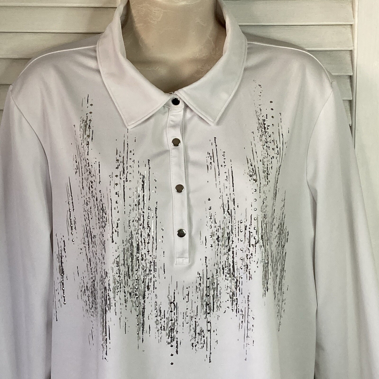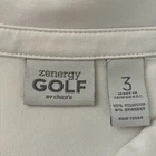 We are pleased to offer a Zenergy Golf by Chico's White w Gray Abstract Design & Studs 1/4 Snap Popover Top; collared, 3/4 sleeves, size 3 (XL). 92% Polyester, 8% Spandex Machine Wash Bust: 46 inches Length: 28 inches Sleeves: 19 inches Clothing & Fabric Items Have Been Steam Cleaned and/or Laundered per Manufacturers Standards/Instructions.