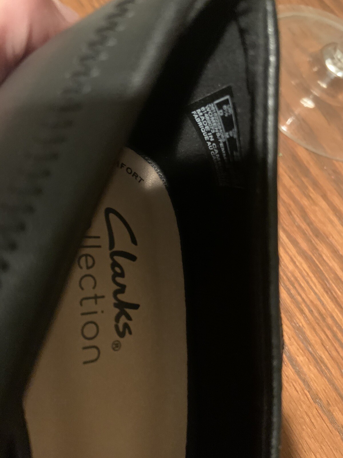 The product is a pair of Clarks women's shoes in size 9, featuring a casual black ballet style design with a leather upper. Clarks is a well-known brand known for its quality and comfort shoes, making it a stylish and practical choice for women looking for versatile footwear options.