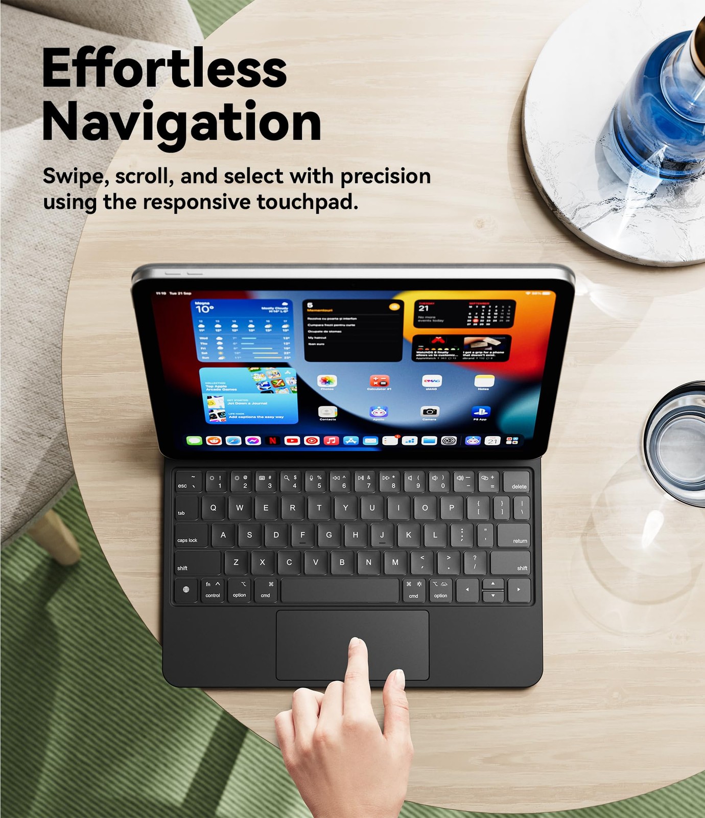 The Magnetic Floating Keyboard for iPad 11th(A16)/10th Generation offers the ultimate in convenience and protection by design. It features a built-in Bluetooth wireless keyboard for effortless text input and a magnetic closure that keeps iPad securely in place. The case also features a 7-color backlit keyboard for low-light use and a touchpad for easy iPad navigation. the case is made from a stain-resistant material that withstands everyday stains and is easy to clean. It also features a built-in -rechargeable battery that provides up to 200 hours of use on a single charge, so you can stay productive wherever you go. Compatibility: Designed for iPad 11th Generation(A16)2025 & iPad 10th Generation 2022 (Model: A2696/A2777/A2757). Not with 10.9-inch iPad 5th and 4th Generation. Please check your iPad model number on the back to ensure a perfect fit before purchasing. Quick-Set Magnetic Stand: Featuring a strong magnetic matrix of 31 magnets that provide up to 2600GS of holding power, the Quick-Set Magnetic Stand seamlessly integrates with your iPad A16 11th gen, allowing you to easily open the floating cantilever stand and adjust it to the perfect angle for typing or browsing. Stain Resistant Surface: SemiSi-tech technology is fused with PU leather to make it easy to wipe away surface stains. Experience a soft, sweat-resistant touch with a plush lining and no need to worry about scratching your iPad 10th generation. Bluetooth 5.2 Connectivity: Low-power Bluetooth stability is provided by the Bluetooth 5.2 chip. Simply pair your iPad A16 with the keyboard and enjoy the convenience of automatic reconnection in everyday use! Scissor-Switches: Each key springs back quickly, and with a comfortable 1-millimeter key travel, you can unleash the iPad 10th Generation typing experience for effortless productivity. Vibrant Backlight Customization: Infuse your workspace with personality the backlight selection. Unleash your creativity by choosing from 7 vivid colors across 3 brightness levels, empowering you to tailor the perfect ambiance for your typing experience case with keyboard for iPad 11th Generation. Elevate your keyboard aesthetics and create an atmosphere that complements your unique style, making every typing session a visually delightful experience. Intuitive Touchpad: Navigate effortlessly with our intuitive touchpad, supporting multi-touch gestures. Swipe to return to the main screen or switch between spaces, unlocking a new realm of control gestures for a seamless and efficient user experience. Power Management: The keyboard for iPad A16(2025) has a -touch wake-up function, charges via USB-, and utilizes battery management and sleep mode to ensure efficient power usage.