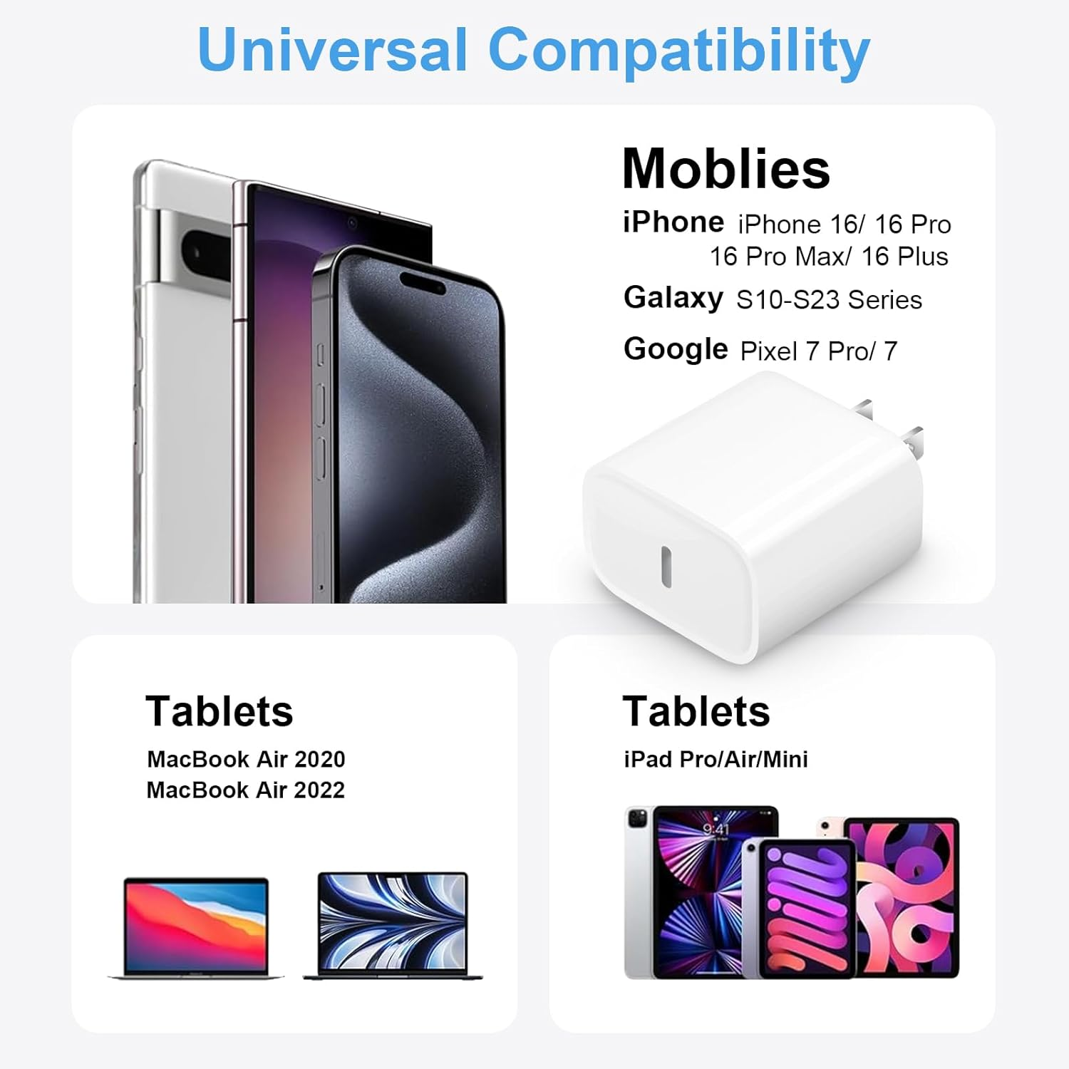 Store New Arrivals Add to Favorite View Feedback Contact Fast deliveries to the customer's home Quality customer service John Make the customers happy! Iphone 16 15 Charger Fast Charging 3+3Pack 20W USB C Wall Charger with 6FT Fast Charging Cable Compatible with Iphone 16/16 Plus/16 Pro/16 Pro Max/Iphone 15/15 Pro Max/Ipad Pro/Airpods Description [iPhone 16 Charger Fast Charging] The 20W USB-C port PD fast adapter USB C wall charger and 6ft usb c fast charging cords,which can reach up to 3X faster than the original 5W charger.That is,it will charge your iPhone 16 15 up to 57% power in just 30 minutes,and only takes 1.8 hours to charge your i Phone fully to save 1.5hrs more time for you [MFi Certified Accessories] With the Original MFi Certified chip,the USB C cables supports iOS versions including all future updates.Also the USB-C PD adapter and Type-C Cable will perfectly protect devices against overheating, excessive current, short-circuit and overcharging. MFi licensed i Phone charging cable promises no warning message pops up. Ensures fast charging to get the 480 Mbps sync data transfer speed [Fast charge iphone 16/15] This fast charging sets included 3 Pack 20W PD wall chargers and 3 Pack iPhone fast charging cables,which can be used separately. Compatible withiPhone 16/16 Pro/16 Pro Max /15/15 Plus/15 Pro/15 Pro Max, iPad Pro 12.9 inch 6th/ 5th / 4th/ 3rd, iPad Pro 11 inch 4th/ 3rd/ 2nd/ 1st, iPad Air 5/4th, iPad Mini 6th, iPad 10th Generation; MacBook Air M1 M2; and other USB-C enabled devices [Convenient & Compact (6 pack )] Great choice to get 3 pack USB C PD adapter wall charger and 3 pack iPhone cable which can satisfy the needs of multiple devices in different places like iPhone/ipad/ AirPods,and also for family or friends to use with. Portable and compact design makes it easier to put into your pocket/bag/backpack for traveling/getting out or in the car use [Safe & Reliable] This 20W PD adapter USB C Wall chargers and cable serial cables/cord FAST Charger Certified by UL, ETL, FCC, CE, ROHS. You will get: 3* 20W PD 3.0 Wall FAST Charger and 3*6FT MFi Certified fast charging Cable, 1-Year replacement guarantee. If you have any concerns, please do not hesitate to contact us! We promise to solve your problems within 12 Hrs Product Description Coreykin is a North American company dedicated to providing a wide variety of high-quality electronic accessories. All of our products are put through rigorous quality control measures to ensure safe and reliable operation. Our products comply with top industry standards and include safety mechanisms that protect your devices. We are proud to stand behind our products and put our customers first in everything we do! 3-Pack Fast chargers for iphone With original MFI Chip, the USB C Fast Charging cord ensures 100% flawless compatibility with your devices. No more trigger warning messages. 20W PD adapter wall charger is 3 times faster than original 5W PD adapter What You Get : 3 x 20W USB-C iPhone 16 15 charger blocks 3x 6ft USB C Fsat charging cords/cables Wide Compatibility Fast Charging Speed Devices List: compatible with iPhone 16/16 Pro/16 Pro Max/16 Plus compatible with iPhone 15/15 Plus/15 Pro/15 Pro Max compatible with iPad Pro 12.9/11 inch 2021/2020/2018 compatible with iPad Air 4, compatible with Mac Book Air 13 inch, Mac Book 12 inch, Gen 4/3, compatible with iPad Pro 11 Gen 2/1, iPad Air 4 Fast Charging For Android Phone Devices List: compatible with Galaxy S11 / S10 / S10+ / S9 / S9+ / S8 / S8+ / Note 9 / Note 8 compatible with Pixel 8 / 7 / 6 / 5 / 4 / 3A / 3XL / 3/ 2XL / 2, and more android usb-c devices MFi Certified fast charging cable With the MFi Chip, the USB-C fast charging cord equips automatic chip recognition function. The MFi Certification ensures 100% flawless compatibility with your devices. No more trigger warning messages. 20w Fast Charging Blocks iPhone fast charger with 20W Power Delivery is powerful enough to rapidly charge your iPhone 16/15/14/13/12/11 up to 50% in only 30 minutes!Compared to the original 5W cable, the 20W iPhone 16 charger provides 3x faster charging speed to all-new USB-C iPhone 16/15/iPad Pro. Ultra-Durable Charging Cable iPhone 16 Fast charging cable with a reinforced joint design that has passed 15,000+ times bending tests for extra protection and durability. The interior of the cable is made of high-quality copper for durability.The connector end and cable are strong for repeated used.Data transmission speeds up to 480MB/s. Item model number CA-43T Whats in the box 3 Pack USB C Wall Charger + 3 Pack 6ft Fast Charging cable Connectivity technologies USB Mounting Type Wall Mount Color 3 Pack Other display features Wireless Product Dimensions 1.18 x 1.57 x 0.5 inches Connector Type USB Type C Compatible Devices function(f) {var _np=(window.P._namespace("DetailPageProductOverviewTemplatesJava"));if(_np.guardFatal){_np.guardFatal(f)(_np);}else{f(_np);}}(function(P) { P.when('A').execute(function(A){ A.on('a:truncate:po-attribute-truncate-3:updated', function(data) { var isTruncated = !data.truncateInstance.getIfTextFits(); var seeMoreElement = document.getElementById('po-attribute-see-more-id-3'); if(seeMoreElement) { seeMoreElement.style.display = isTruncated ? '' : 'none'; } }) }); })); iPhone 16/16 Pro/16 Pro Max/16 Plus/16e, iPhone 15/15 Pro/15 Pro Max/15 Plus, 2022/2021/2020/2018 iPad Pro 12.9/11 inch 6th/5th/4th/3rd, iPad 10th Generation, iPad Air 5th/4th, iPad Mini 6, Samsung Galaxy, Google Pixel and more USB Type C Android phones See more Item Weight 7.4 ounces Connectivity Technology USB Input Voltage 5 Volts Special features Short Circuit Protection, Fast Charging Special Feature Short Circuit Protection, Fast Charging Compatible Phone Models function(f) {var _np=(window.P._namespace("DetailPageProductOverviewTemplatesJava"));if(_np.guardFatal){_np.guardFatal(f)(_np);}else{f(_np);}}(function(P) { P.when('A').execute(function(A){ A.on('a:truncate:po-attribute-truncate-4:updated', fun